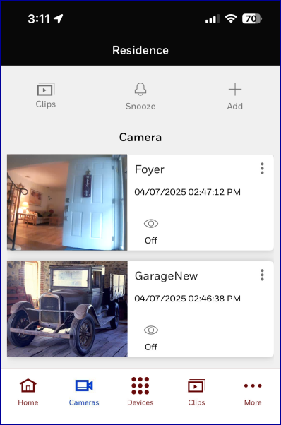 If your Remote Service account has more than one Location: Before you do anything else, use the dropdown at the top of the Home screen to select the premises where the camera is located.