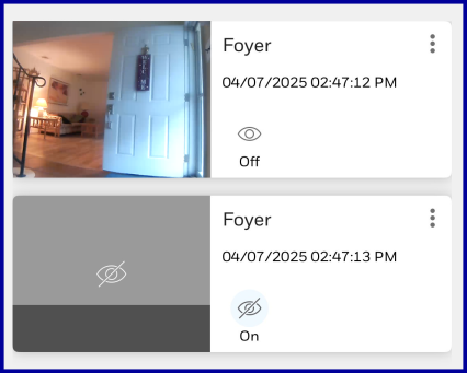 If the camera is in Privacy mode, you won’t be able to view its stream on the apps or the website. Recordings will not be triggered by motion or sound detection, nor can video recording and still pictures be triggered manually.