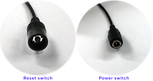 Find the camera's Reset switch (at left), on its breakout cable. Don't mistake it for the power switch, seen at right.