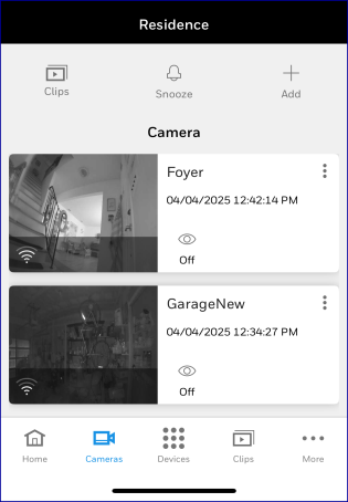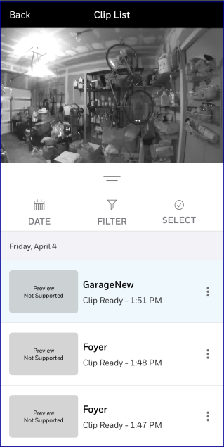 - At the top of the Cameras screen, touch the Clip List button at upper left. The most recently-recorded clips from your cameras are listed:
