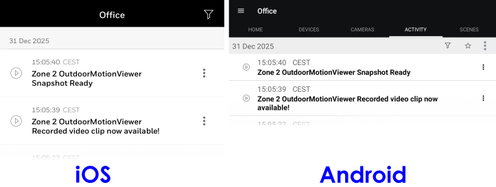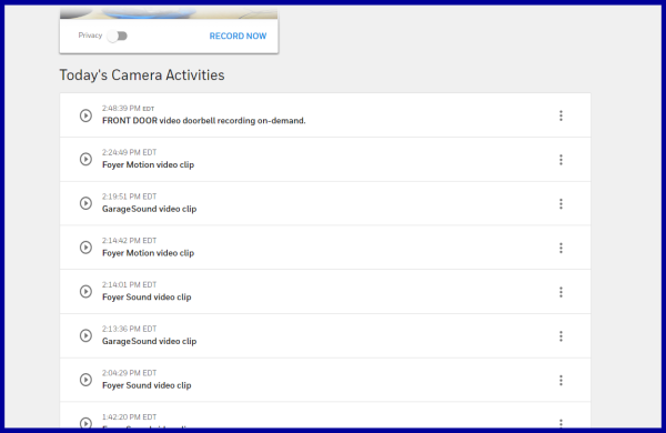 In the second illustration, the Activity page displays all activity, system-wide, including Arm and Disarm events, along with motion/sound detection events and clip/still recordings from your cameras. For more information, see the FAQ What's in the Activity log? (And can I sort or filter it?)