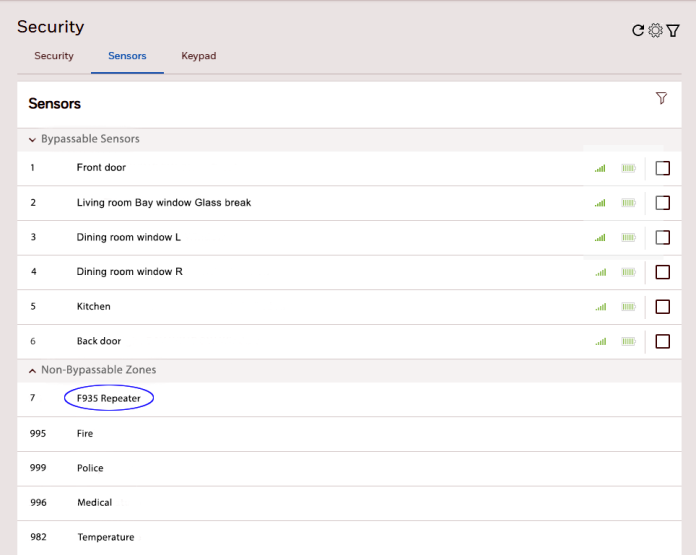 When a repeater is integrated into the system, it appears as one of the system's non-bypassable zones.