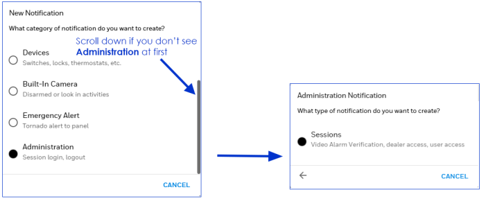 The Master User can set up a notification of the dealer logging in to the account. This notification is created on the Notifications List page; click the Add notification button. In the New Notification dialog box, select Administration and then, Sessions. This example is taken from the Android app, but the steps you take are similar on the iOS app or the website.