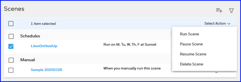 Click Pause Scene to put any scheduled or triggered scene on hold. Note that Manual scenes cannot be Paused (or Resumed)